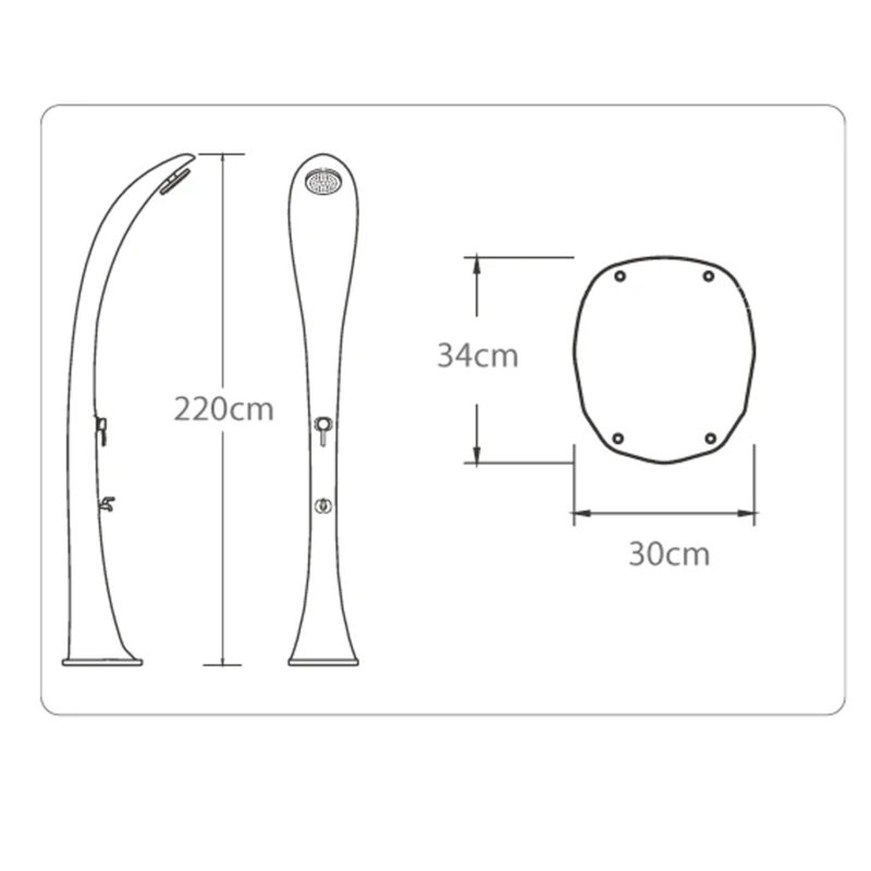 Il design unico della “Foglia Blu” si ispira alla natura, inserendosi armoniosamente in ogni spazio all`aperto. Con un`altezza di 220 cm, questa doccia solare non solo si eleva come un elegante elemento di design, ma offre anche funzionalità eccezionali. Grazie al riscaldamento solare, l`acqua si scalda naturalmente, permettendoti di godere di una piacevole doccia calda senza ulteriori consumi energetici.