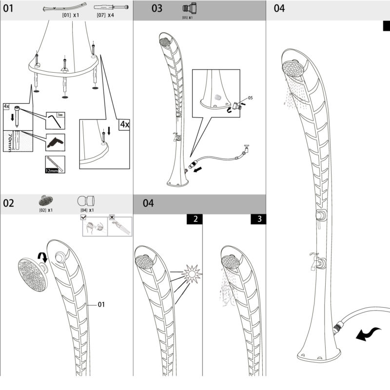 Il tappo di scarico per il drenaggio invernale è un dettaglio importante, che rende questa doccia solare facile da mantenere e da preparare per l`inverno, evitando danni causati dal gelo. La robusta base di 340 x 300 mm assicura stabilità e sicurezza, mentre la pressione massima di esercizio di 3 bar garantisce un`esperienza di doccia sempre piacevole e rilassante.