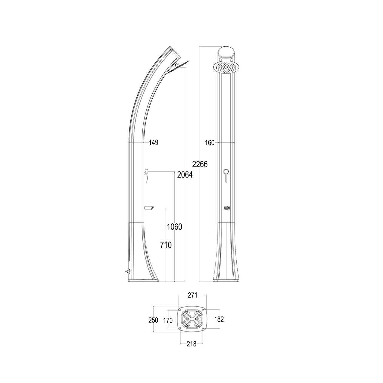 Dimensioni e Accessori: Altezza 266,6 cm, con un soffione rotondo orientabile di 15.24 cm di diametro, accessori in ottone, tubi interni in silicone con resistenza a 12 Kgs di pressione, peso di 13.5 kg.
